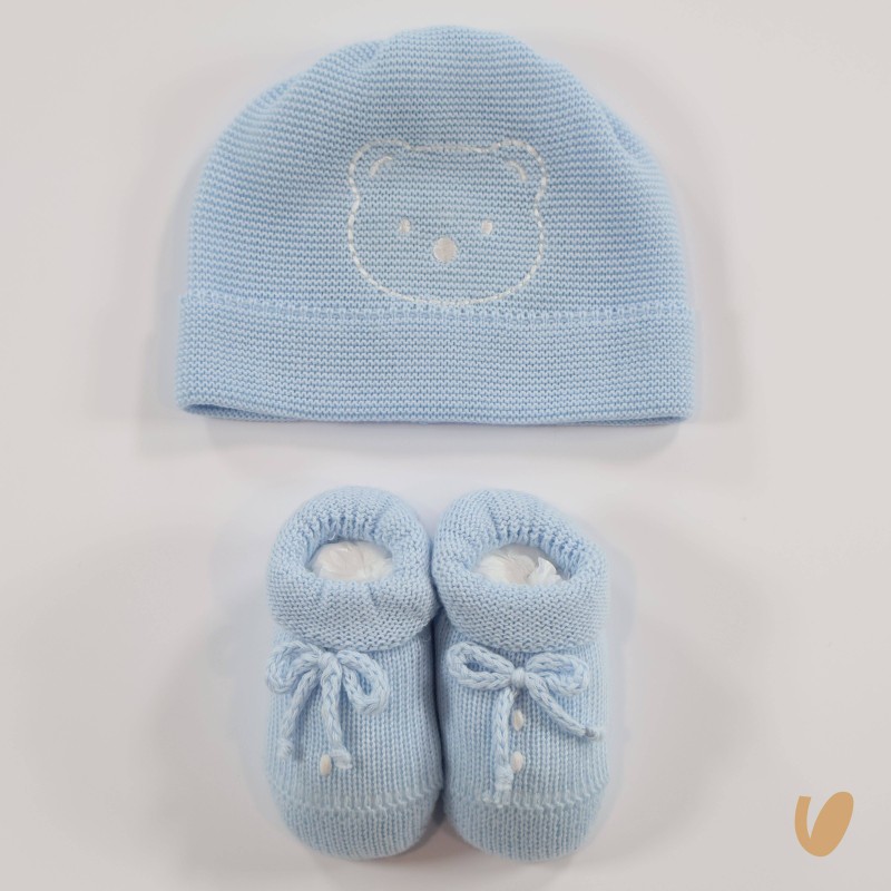Complete hat and babbuckets in cotton thread with bear embroidery