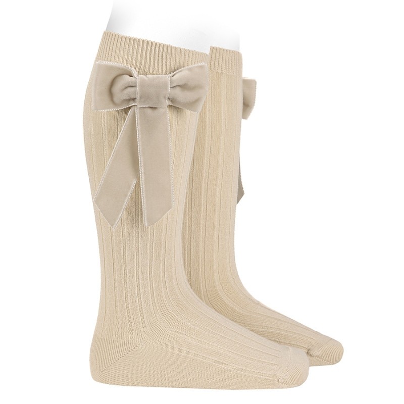Long knee sock, ribbed processing and velvet bow application