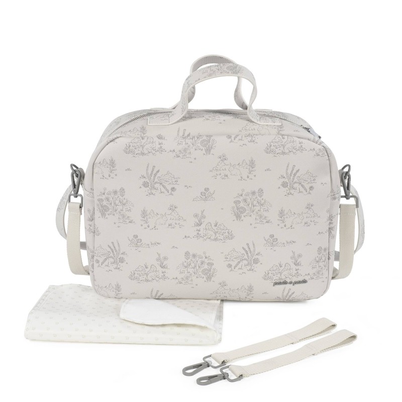 The Toile de Jouy Cream stroller bag in Pasito is a unique model, made of durable and delicate printed eco-leather to carry everything your child needs when leaving home. It is a very elegant and practical design that offers a great ability to bring everything. It is equipped with double handles, one long to hang on the shoulder and short handles. Includes additional universal handles to hang it on the stroller. You can also use it to store your things and avoid carrying two bags at once. If you are waiting for a child, you can have it ready as a baby bag for the hospital. Quality finishing. The bag has an inner lining and pockets to place the bottle, cutlery, wipes, diapers, creams and everything your baby needs in an organized way. Among the pockets there is a thermal pocket for bottles and a plasticized pocket for wet clothes. It also has an external back pocket. Changing Mat included. It is made of high quality materials, free of azoic, phthalate and harmful substances for health. It can also be washed by hand or in the washing machine at temperatures up to 30o. The products for children Pasito in Pasito have a very different design from the others. Their collections are characterized by attention to detail, always thought from a practical point of view. They use high quality materials to highlight elegance and harmony in each of their pieces. Their models are exclusive and have an unmistakable style, designed for modern moms who have good taste and appreciate the details as much as they do. Specifications: Material: Ecopelle. Color: Cream. Dimensions: 40X15X30 cm.