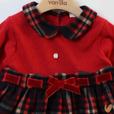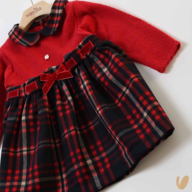 Knitted dress with plissè Scottish skirt, waistband with velvet, tartan collar