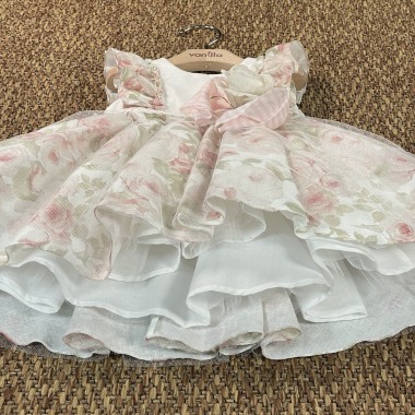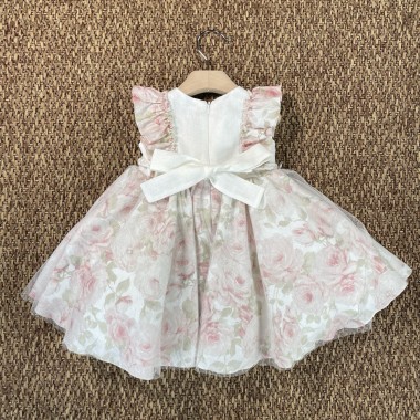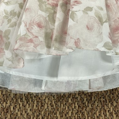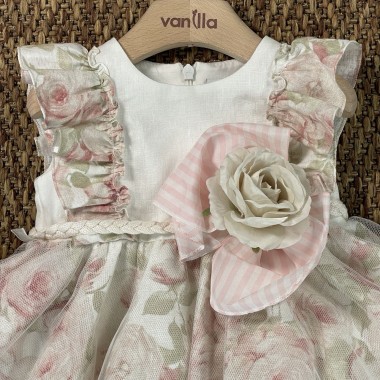 Dress based on horny linen cream and skirt and pink floral sleeves, tulle skirt with braid belt and striped bow with flower