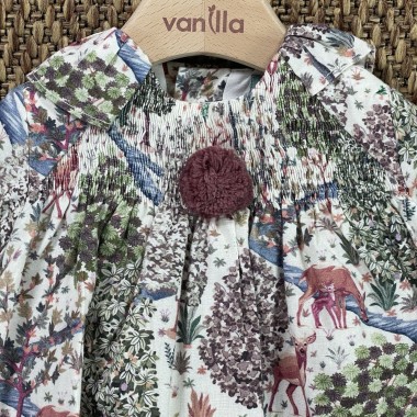 Mini long sleeve dress, curled corpet and application of ponpom, fanatsia landscape with reindeer, trees and torrents