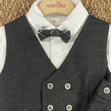 Elegant dress with beige velvet details, double-breasted vest sewn on the shirt in the front, removable bow tie, cotton lined trousers