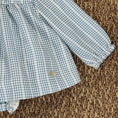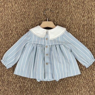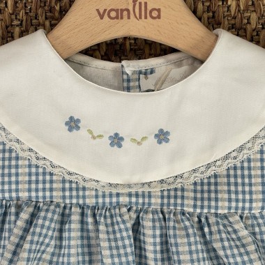 Mini dress with blue and beige square butts, wide cotton neck, flower embroidery and edge in valencienne lace