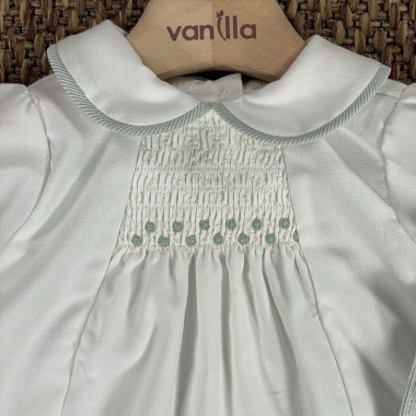 Complete cotton shirt with smocked embroidery on the front, collar profile in aqua green velvet