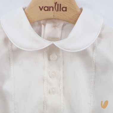 blouse with point-to-day handpiece application and 3 mother-of-pearl buttons on the front, round collar and functional tan on the back,
