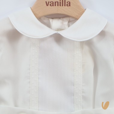 shirt with application on the front, of organza striped round collar and functional buttoning on the back,