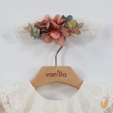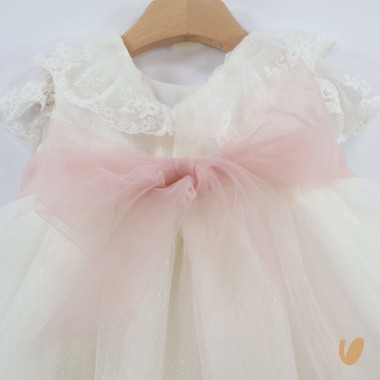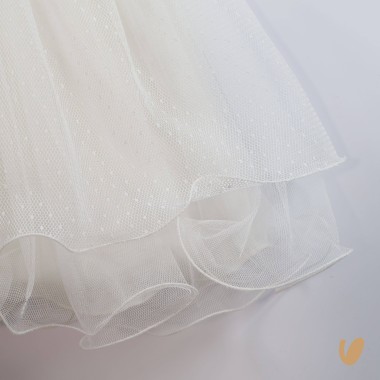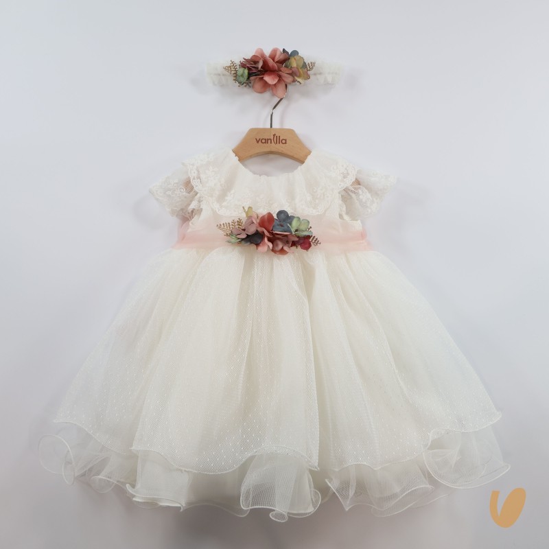 Dress in tulle polka dots with collar and lace sleeves, fixed tulle belt with flowers and matching elastic band