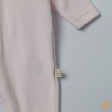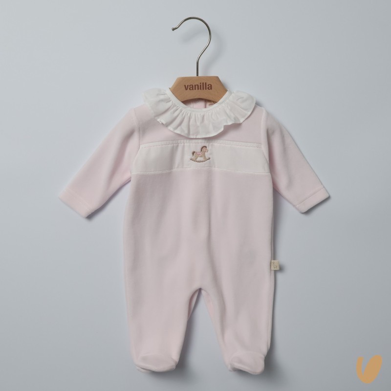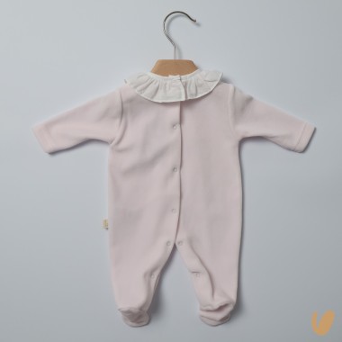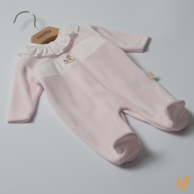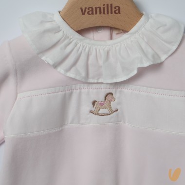 Suit in soft cynilles of the Portuguese company Babygi with central application in organic cotton and adondolo horse embroidery, rouche organic cotton collar