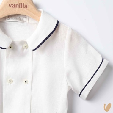 A fresh and sophisticated elegance, perfect for summer weddings and formal ceremonies. The short sleeve shirt has a round collar finished with navy blue piping and double row of front buttons, classic detail that recalls the sartorial tradition.