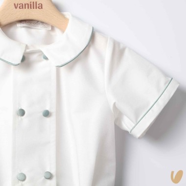 A head of high manufacture designed for solemn occasions and weddings, ideal for the role of paste. The short-sleeved shirt has a round collar with refined green piping powder and a double row of front buttons covered in fabric, detail that recalls the elegance of the Italian sartorial tradition.