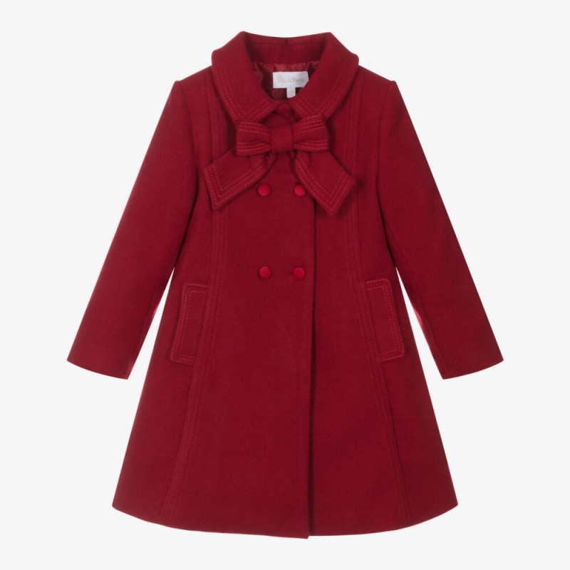 Double-breasted English style coat with fixed bow, collar and rear pleat with belt