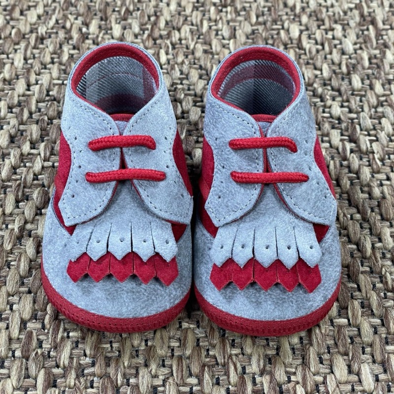 Velor laced shoe combined with gray inserts and fringes, tartan lining
