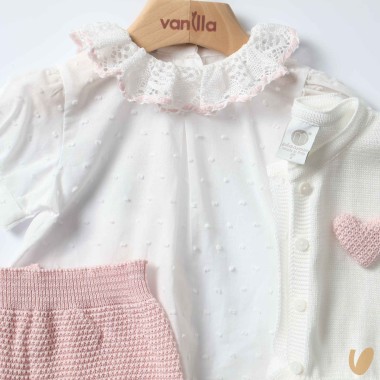 Short sleeve shirt in Plumitis and macramé neck