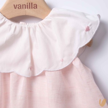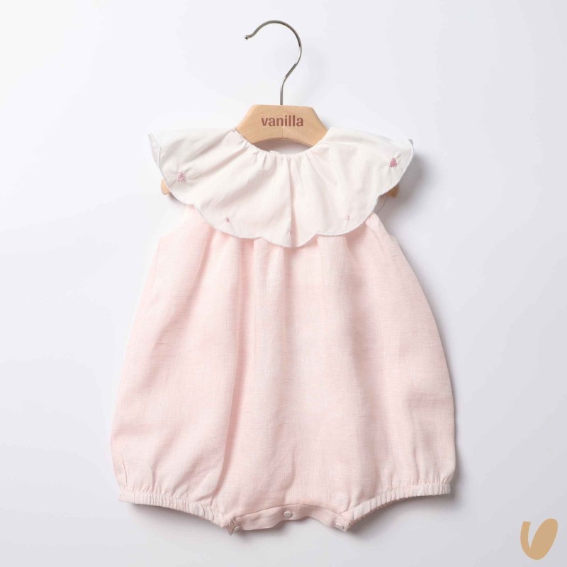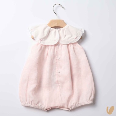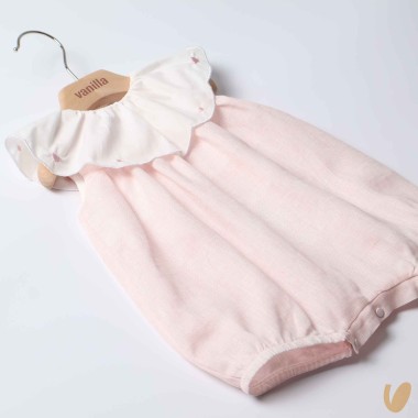 Romper in pure linen with volant neck in cotton and embroidery